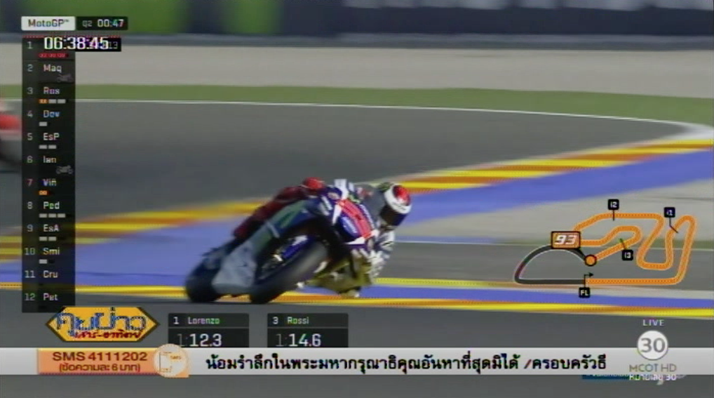 รถจักรยานยนต์ทางเรียบ โมโตจีพี สนามสุดท้ายของฤดูกาล “บาเลนเซีย กรังด์ ปรีซ์” ที่สนาม ริคาร์โด ทอร์โม เซอร์กิต เมืองบาเลนเซีย ประเทศสเปน เมื่อคืนที่ผ่านมา เป็นการแข่งขันรอบควอลิฟาย ชิงตำแหน่งกริดสตาร์ท โดย ฆอร์เก ลอเรนโซ นักบิดของโมวิสตาร์ ยามาฮ่า คว้าโพล โพซิชั่น สนามที่ 65 ของเขาด้วยเวลาต่อรอบ 1 นาที 29.401 วินาที และยังเป็นสถิติใหม่ของสนาม ตามด้วย มาร์ค มาร์เกวซ แชมป์โลก จากเรปโซล ฮอนด้า อันดับ 2 และ วาเลนติโน รอสซี จากยามาฮ่า มาเป็นอันดับ 3 ส่วนรุ่นโมโตทู โยฮัน ซาร์โก แชมป์โลกของฤดูกาลนี้จากค่ายอาโย มอเตอร์สปอร์ต คว้าโพล โพซิชั่น ด้วยเวลา 1 นาที 34.879 วินาที ก่อนเตรียมตัวลุ้นแชมป์สั่งลาปีนี้ และ รัฐภาคย์ วิไลโรจน์ หนึ่งเดียวของไทยจาก อิเดมิตสึ ฮอนด้า ทีมเอเชีย โดยจะออกสตาร์ทอันดับที่ 25