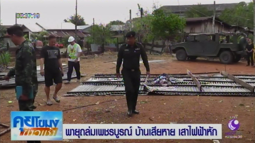 ขณะที่ จ.ชัยภูมิ พายุฤดูร้อนพัดถล่ม ต.บ้านเพชร อ.บำเหน็จณรงค์ เมื่อช่วงเย็นวานนี้ บ้านเรือนเสียหายกว่า 100 หลัง รวมทั้งยุ้งฉางข้าว โรงเลี้ยงสัตว์ คอกสุกร แผงค้าขายริมถนนล้มระเนระนาด และเสาไฟฟ้าแรงสูงขนาดใหญ่ล้มเสียหายเป็นจำนวนมาก ทำให้ไฟฟ้าดับเป็นบริเวณกว้าง