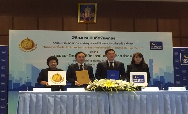 ทั้งนี้ วันนี้ (16 มี.ค.) อธิบดีกรมธนารักษ์และนายวีรเดช อัครผลพานิช รองกรรมการผู้จัดการ บริษัท เคาน์เตอร์เซอร์วิส จำกัด ร่วมลงนามบันทึกข้อตกลงโครงการเพิ่มประสิทธิภาพช่องทางชำระค่าเช่าทางอิเล็กทรอนิกส์ผ่านบริษัท เคาน์เตอร์เซอร์วิส จำกัด โดยผู้เช่าที่ราชพัสดุสามารถนำใบแจ้งค่าเช่าไปชำระที่ร้านสะดวกซื้อ 7-ELEVEN และร้านค้าที่มีสัญลักษณ์เคาน์เตอร์เซอร์วิสทั่วประเทศ ตลอด 24 ชั่วโมง ซึ่งมีสาขากว่า 10,000 แห่งทั่วประเทศ ตั้งแต่วันที่ 24 มีนาคมนี้เป็นต้นไป สำหรับค่าธรรมเนียมการชำระเงินจะเรียกเก็บอัตราเดียวทั่วประเทศ ประกอบด้วย วงเงินต่ำกว่า 30,000 บาท ค่าธรรมเนียม 15 บาทต่อครั้ง วงเงิน 30,000 – 60,000 บาท ค่าธรรมเนียม 30 บาทต่อครั้ง วงเงิน 60,000 – 90,000 บาท ค่าธรรมเนียม 45 บาทต่อครั้ง นอกจากนี้ ยังเป็นการตอบสนองนโยบายรัฐบาลลดใช้เงินสดและเนชั่นแนลอี-เพย์เม้นท์