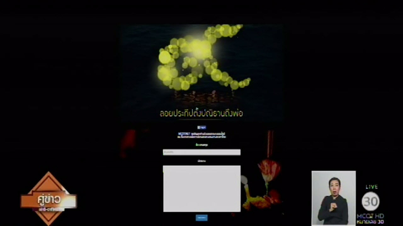 บมจ.อสมท และ MCOT.NET เชิญชวนชาวไทย “ลอยประทีปตั้งปณิธานถึงพ่อ” เพื่อสืบสานประเพณีลอยกระทง และน้อมรำลึกในพระมหากรุณาธิคุณ ของพระบาทสมเด็จพระปรมินทรมหาภูมิพลอดุลยเดช โดยการลอยกระทงออนไลน์ผ่านเว็บไซต์ www.mcot.net/loikrathong ซึ่งเมื่อเข้าสู่หน้าเว็บสามารถพิมพ์ชื่อนามสกุล แล้วพิมพ์คำปณิธาน จากนั้นกระทงออนไลน์จะไปรวมแปรอักษรเป็นเลข ๙ ซึ่งสามารถแชร์ต่อผ่านเฟซบุ๊กได้อีกด้วย.-สำนักข่าวไทย