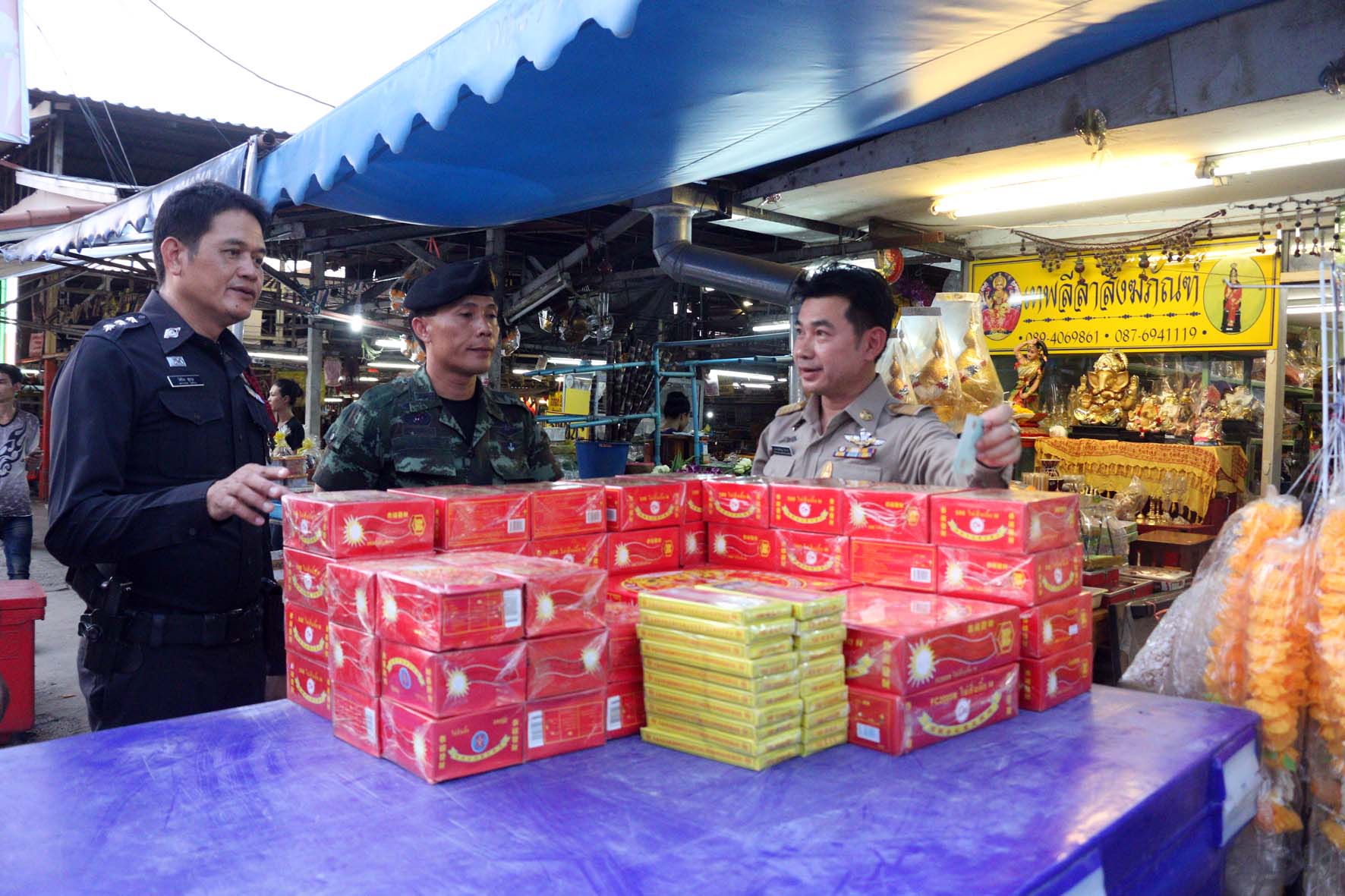 ชลบุรี 12 พ.ย.-ฝ่ายปกครองสนธิกำลังทหารและตำรวจบางละมุง เข้าจับกุมร้านสังฆภัณฑ์ลักลอบขายประทัด 2 ราย ยึดของกลางประทัดกล่องแดงเกือบ 1 แสนนัด