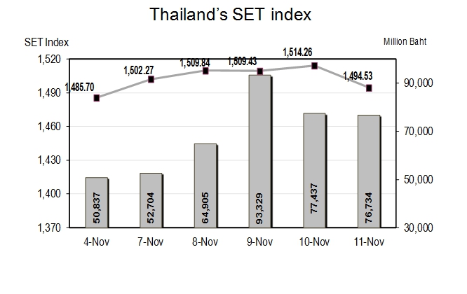 ส่วนตลาดหุ้นไทยสัปดาห์นี้ ดัชนีหุ้นไทยลดลงปลายสัปดาห์ หลังผลการเลือกตั้งประธานาธิบดีสหรัฐฯ โดยดัชนี SET ปิดที่ระดับ 1,494.53 จุด เพิ่มขึ้น 0.59% จากสัปดาห์ก่อน มูลค่าการซื้อขายเฉลี่ยต่อวันเพิ่มขึ้น 45.95% จากสัปดาห์ก่อน มาที่ 73,021.58 ล้านบาท ส่วนตลาดหลักทรัพย์ MAI ปิดที่ 587.93 จุด เพิ่มขึ้น 1.44% จากสัปดาห์ก่อน