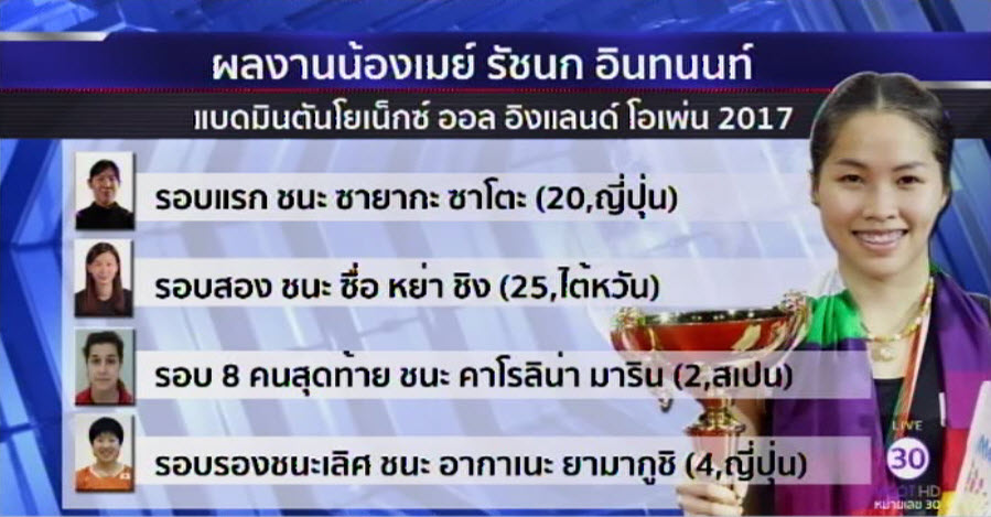 หลังจากที่น้องเมย์ รัชนก อินทนนท์ นักแบดสาวมือ 7 ของโลก สร้างประวัติศาสตร์ผ่านเข้ารอบชิงชนะเลิศ แบดมินตันโยเน็กซ์ ออล อิงแลนด์ โอเพ่น ได้เป็นสมัยที่ 2 หลังจากเคยทำได้เมื่อปี 2013 ด้วยการโชว์ฟอร์มได้อย่างยอดเยี่ยมใน 2 รอบล่าสุด เอาชนะ คาโรลินา มาริน มือ 2 ของโลกและแชมป์โอลิมปิกเกมส์คนล่าสุดจากสเปน ในรอบ 8 คนสุดท้าย ต่อด้วยรอบรองชนะเลิศเมื่อคืนที่ผ่านมา ล้างตาชนะ อากาเนะ ยามากูชิ มือ 4 ของโลกจากญี่ปุ่น ที่น้องเมย์ แพ้มาในการพบกัน 2 ครั้งล่าสุด ในโอลิมปิกเกมส์ 2016 รีโอเกมส์ และไชน่า โอเพ่น ผ่านเข้ารอบชิงชนะเลิศรายการนี้เป็นครั้งที่ 2 หลังจากเคยทำได้เมื่อปี 2013 โดยจะพบกับ ไถ่ ซื่อ หยิง มือ 1 ของโลกจากไต้หวัน ในคืนวันนี้เวลาประมาณ 23.00 น.ตามเวลาประเทศไทย