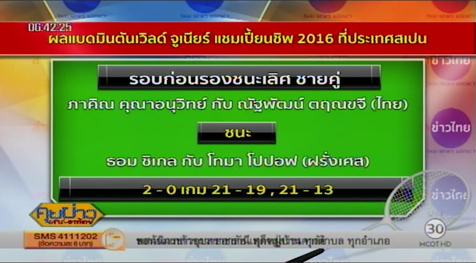 สเปน 12 พ.ย.-กัณตภณ หวังเจริญ กับ พรปวีณ์ ช่อชูวงศ์ สองนักแบดเยาวชนไทย ผ่านเข้ารอบตัดเชือก แบดมินตันเยาวชนชิงแชมป์โลก ที่สเปน