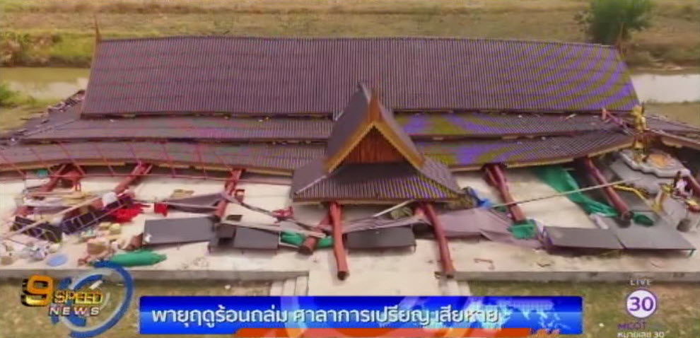 มหาสารคาม 10 มี.ค. – พายุฤดูร้อน ฝนตกหนัก และลมกระโชกแรง พัดศาลาการเปรียญวัดป่าบุพนิมิตร บ้านหนองหิน อ.เมือง จ.มหาสารคาม ที่อยู่ระหว่างก่อสร้างพังถล่มลงมาทั้งหลัง ความเสียหายไม่ต่ำกว่า 5 ล้านบาท ส่วนพระลูกวัดที่เข้าไปทำความสะอาดภายในศาลารีบออกมา ได้รับบาดเจ็บเพียงเล็กน้อย