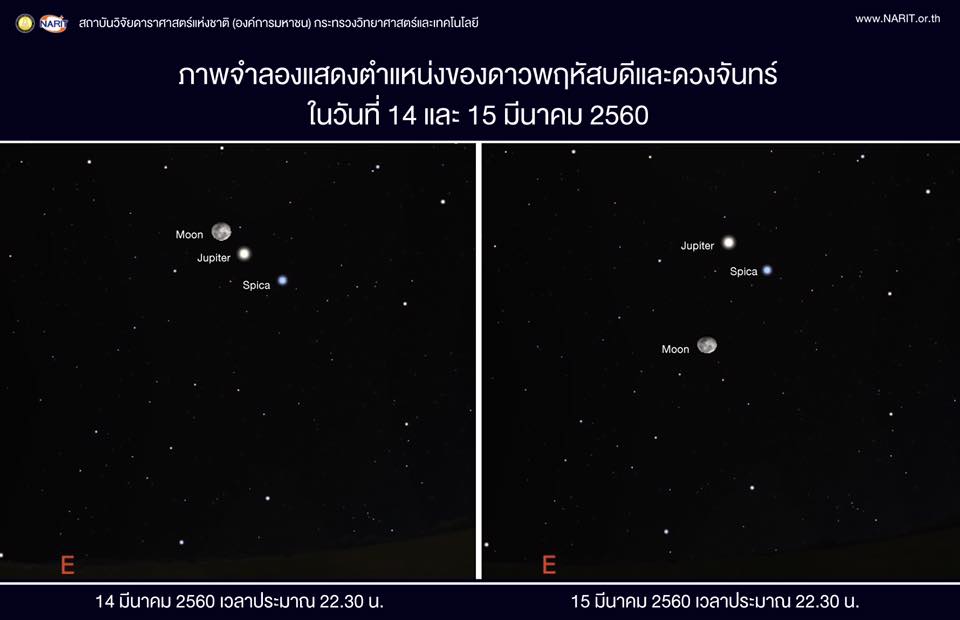 นายศุภฤกษ์ คฤหานนท์ หัวหน้างานบริการวิชาการทางดาราศาสตร์ สดร. เปิดเผยว่า วันที่ 14-15 มีนาคม 2560 จะเกิดปรากฏการณ์ดาวเคียงเดือน ดาวพฤหัสบดี และดาวสไปกา (ดาวฤกษ์ที่สว่างที่สุดในกลุ่มดาวหญิงสาว) จะปรากฏสว่างเคียงข้างดวงจันทร์ ทางทิศตะวันออก ตั้งแต่เวลาประมาณ 21:00 น. และจะตกลับขอบฟ้าทางทิศตะวันตกในเวลารุ่งเช้า คืนวันที่ 14 มีนาคม ดาวพฤหัสบดีจะปรากฏในตำแหน่งต่ำกว่าดวงจันทร์ และมีดาวสไปกาอยู่ถัดลงมา ดาวพฤหัสบดีและดวงจันทร์จะปรากฏในตำแหน่งใกล้กันมากที่สุด เวลาประมาณ 05:10 น. ของวันที่ 15 มีนาคม ห่างเพียง 2 องศา (หนึ่งนิ้วก้อยของเราเมื่อเหยียดสุดแขนจะมีระยะเชิงมุม 1 องศา)