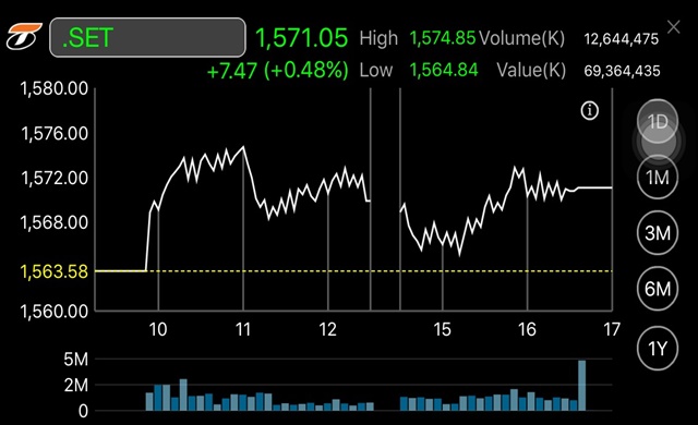 กรุงเทพ ฯ 5 ม.ค. – ผู้สื่อข่าวรายงานว่าดัชนีตลาดหลักทรัพย์ฯ ปิดช่วงบ่ายวันนี้ (5 ม.ค.) ที่ระดับ 1,571.05 จุด เพิ่มขึ้น 7.47 จุด หรือร้อยละ0.48 มูลค่าการซื้อขาย 69,364.44 ล้านบาท ดัชนีเคลื่อนไหวแดนบวกตลอดทั้งวัน ขยับขึ้นแตะจุดสูงสุดของวันที่ระดับ 1,574.85 จุด ส่วนดัชนีทำจุดต่ำสุดของวันอยู่ที่ 1,564.84 จุด
