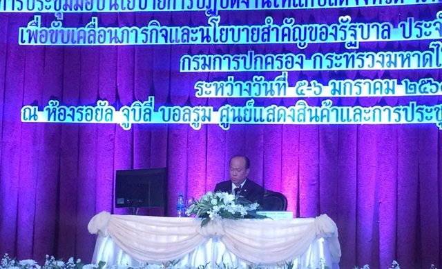 เมืองทองธานี 5 ม.ค.-รมว.มหาดไทย มอบนโยบายแก่ปลัดจังหวัด นายอำเภอ เพื่อขับเคลื่อนนโยบายสำคัญของรัฐบาลสู่การปฏิบัติในระดับพื้นที่ประจำปี 60 โดยขอให้กำนัน ผู้ใหญ่บ้าน ประเมินการทำงานตนเอง โดยต้องอยู่บนพื้นฐานและหลักธรรมาภิบาล