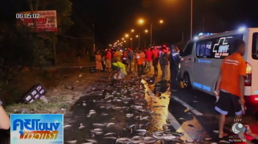 ศรีสะเกษ 5 ม.ค.-รถกระบะบรรทุกพริกชนท้ายรถกระบะบรรทุกปลา บริเวณถนนศรีสะเกษ-ขุขันธ์ เสียหลักตกร่องน้ำข้างทาง ส่วนรถบรรทุกปลาพุ่งเข้าบ้านข้างทาง ภรรยาเจ้าของบ้านบาดเจ็บ ปลากระจายเกลื่อนเต็มถนน