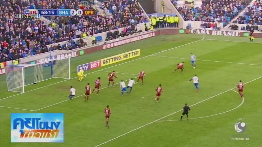 ฟุตบอลเดอะ แชมเปียนชิพ อังกฤษ ที่สนามเอเมกซ์ สเตเดียม ทีม “นกนางนวล” ไบรท์ตัน แอนด์ โฮฟ อัลเบียน ก่อนแข่งอยู่อันดับ 2 เปิดบ้านพบกับ “ทหารเสือราชินี” ควีนส์ปาร์ค เรนเจอร์ส อันดับที่ 20 เกมนี้ MCOT Family หมายเลข 14 ถ่ายทอดสด นาทีที่ 11 แซม บัลด็อก ได้บอลกลางสนามก่อนเลี้ยงตัดไปหน้ากรอบเขตโทษแล้วยิงด้วยซ้ายเข้าไปอย่างสวยงาม ไบรท์ตัน นำก่อน 1-0 นาทีที่ 53 มัสซิโม ลวนโก ไปทำฟาวล์ เดล สตีเฟนส์ ในกรอบเขตโทษ ผู้ตัดสินให้เป็นจุดโทษ ก่อนที่ เกลน มาร์รีย์ จะสังหารเข้าไป ให้ไบรท์ตันนำห่างเป็น 2-0 ก่อนที่นาทีที่ 56 เนดุม โอนูโอฮา แนวรับทีมเยือน จะโดนใบแดงไล่ออกจากสนาม ควีนส์ปาร์คฯ เหลือแค่ 10 คน นาทีที่ 69 แอนโธนี นอคการ์ท ได้บอลในกรอบเขตโทษด้านขวา ก่อนเลี้ยงตัดเข้าในแล้วยิงด้วยซ้ายเข้าไป ก่อนที่จะอุทิศประตูนี้แด่คุณพ่อที่เพิ่งเสียชีวิตไป จบเกม ไบรท์ตันเอาชนะ 3-0 เก็บเพิ่มเป็น 51 คะแนนจาก 23 เกม แซงนิวคาสเซิล ยูไนเต็ด ที่มี 49 คะแนน ขึ้นไปนำเป็นจ่าฝูง ส่วน ควีนส์ปาร์คฯ รั้งอันดับ 20 มีอยู่ 23 คะแนน