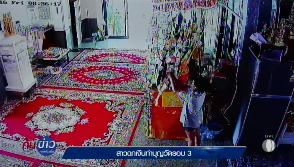 นายสุพจน์ เล่าว่า หญิงสาวจากภาพวงจรปิดคนนี้ เคยเข้ามาลักเงินบริจาคทางวัดไปแล้ว 2 ครั้ง โดยครั้งแรกลักเอาเหรียญในตู้บริจาค และถูกทางพระลูกวัดจับได้ และตักเตือนไป ส่วนครั้งที่ 2 ย่องเข้ามาลักเงินบริจาคอีก แต่พระลูกวัดพบเข้าได้วิ่งหนีไป กระทั่งครั้งนี้เป็นครั้งที่ 3 หญิงสาวที่ก่อเหตุได้ย่องเข้ามาจากทางด้านหลังวัด ตรงเข้ามายังต้นผ้าป่า และขโมยเอาธนบัตรฉบับละ 100 บาท ไปกว่า 20 ฉบับ ก่อนที่พระลูกวัดจะมาเห็น และวิ่งหนี โดยที่พระลูกวัดพยายามไล่ตามแต่ไม่ทัน