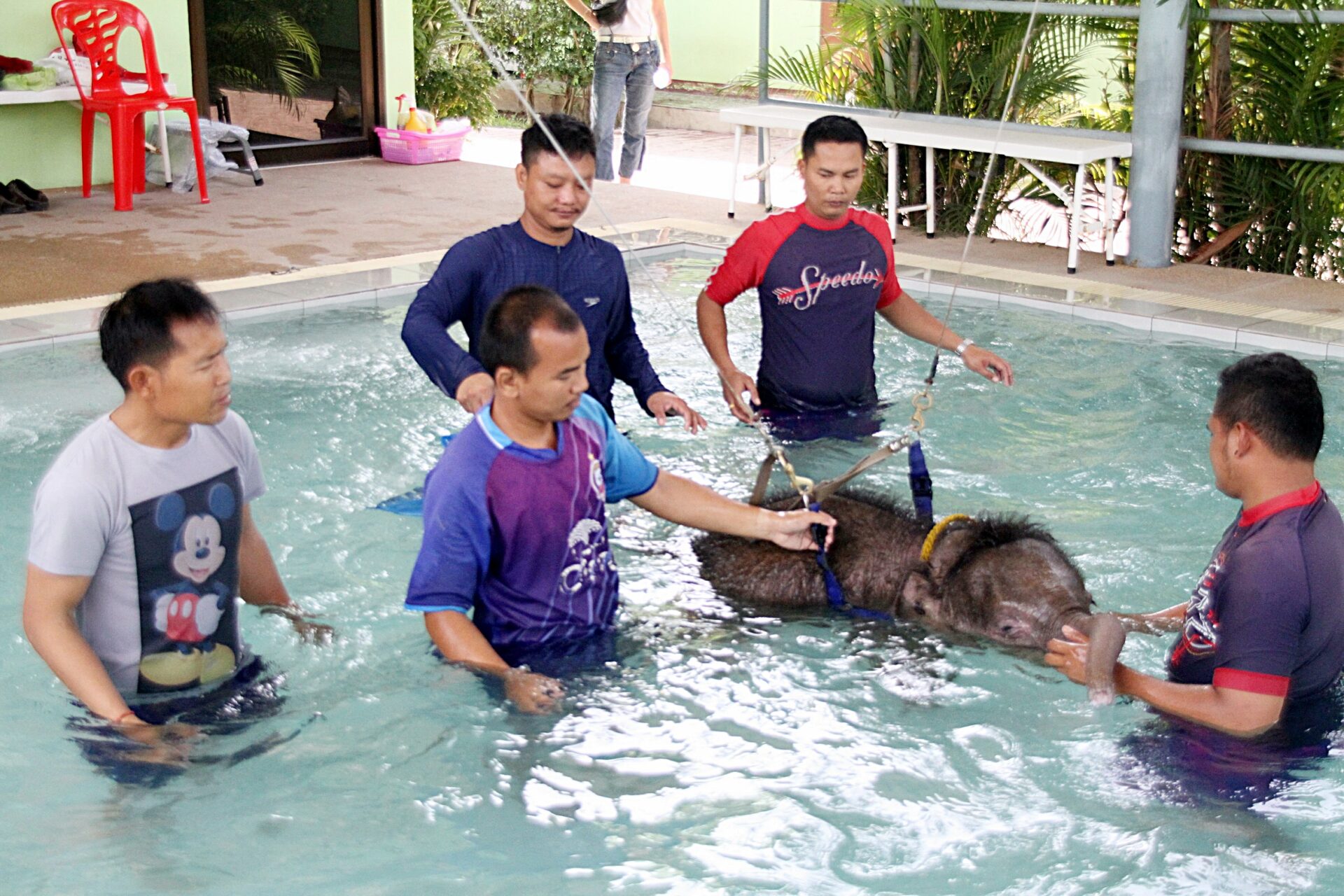 น.สพ.เผด็จ ศิริดำรง สัตวแพทย์ประจำสวนนงนุชพัทยา และเจ้าหน้าที่นำลูกช้างป่า “พังฟ้าแจ่ม” รักษาอาการบาดเจ็บด้วยธาราบำบัดที่ศูนย์กายภาพและฝึกสุนัข โรงพยาบาลสัตว์เนินพลับหวาน ม.7 ซ.หนองไม้แก่น 10 ต.หนองปรือ อ.บางละมุง จ.ชลบุรี เพื่อให้ขาแข็งแรงขึ้น เนื่องจากพังฟ้าแจ่มถูกบ่วงดักสัตว์รัดข้อเท้าหน้าซ้ายในป่าเขาแก่งหางแมว จ.จันทบุรี ขณะพลัดหลงโขลงอายุได้ 3 เดือน เมื่อเดือนตุลาคมที่ผ่านมา และชาวบ้านได้ช่วยเหลือนำช้างมาส่งให้เจ้าหน้าที่ของกรมอุทยานแห่งชาติ สัตว์ป่าและพันธุ์พืช แต่เนื่องจากช้างป่ายังเล็ก ยังไม่หย่านม เกรงว่าจะล้มได้