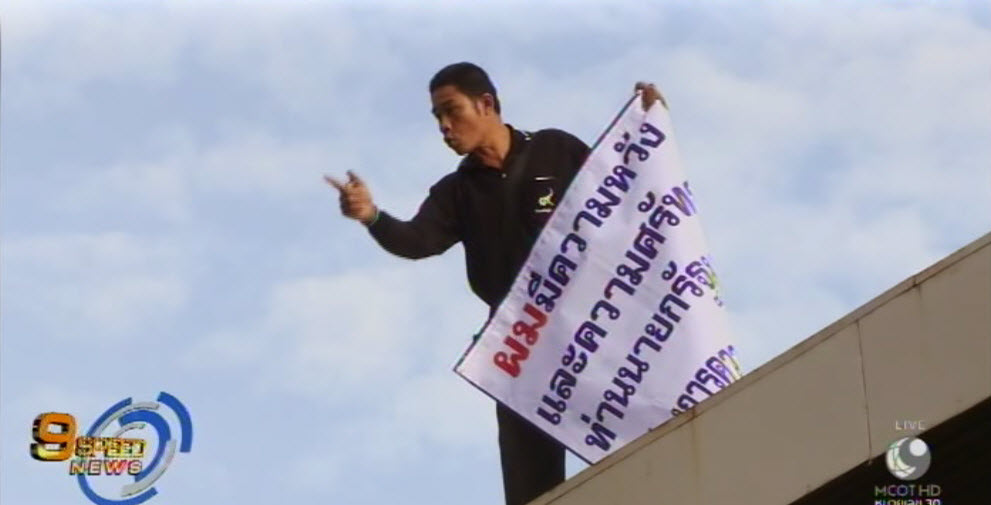 ก่อนที่จะมีการประชุม ครม.วันนี้ มีชายวัย 44 ปี ชาว จ.น่าน แอบปีนเข้ามาภายในทำเนียบรัฐบาล บริเวณประตู 4 ขึ้นไปบนหลังคาธนาคารออมสิน พร้อมกับจุดระเบิดปิงปอง เพื่อขอความเป็นธรรม หลังจากเคยร้องเรียนกับนายกรัฐมนตรีผ่านศูนย์บริการประชาชน เรื่องการประมูลงานใน จ.น่าน ว่ามีผู้เข้าแข่งขันจำนวนมาก และอาจไม่ได้รับความเป็นธรรม ขณะนี้ตำรวจประจำทำเนียบฯ อยู่ระหว่างการเจรจาเกลี้ยกล่อมให้ลงมาจากหลังคา. – สำนักข่าวไทย