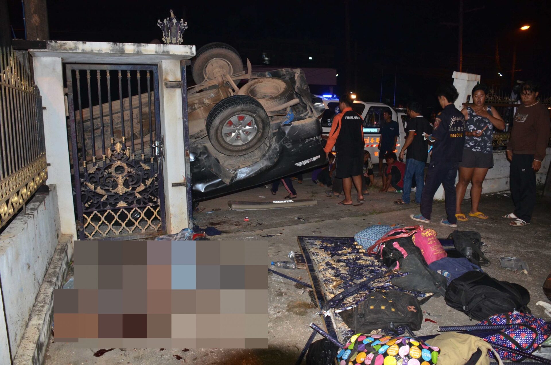 เมื่อเวลา 04.00 น. (26 ธ.ค.) ร.ต.ท.นรินทร์ รอดชู รองสารวัตรสอบสวน สภ.เมืองชุมพร รับแจ้งอุบัติเหตุรถกระบะเสียหลักชนรั้วบ้านย่านถนนเมืองชุมพร ต.วังไผ่ ช่องทางขาเข้าตัวเมืองชุมพรมีผู้บาดเจ็บจำนวนมาก จึงประสานหน่วยกู้ชีพกู้ภัยเข้าช่วยเหลือเป็นรถกระบะ ทะเบียน 7012 ชุมพร อยู่ในสภาพหงายท้องและสัมภาระกระจายเกลื่อน พร้อมผู้บาดเจ็บแรงงานต่างด้าวชาย-หญิง 15 คน เจ้าหน้าที่เร่งปฐมพยาบาลนำส่งโรงพยาบาลชุมพรเขตรอุดมศักดิ์ ส่วนภายในรถคนขับเสียชีวิต ชื่อ นายอภิสิทธิ์ น้อยวารี อายุ 39 ปี ชาว จ.ชุมพร และหน้ารั้วบ้านอีก 2 ศพ เป็นชายชาวเมียนมาร์ อายุ