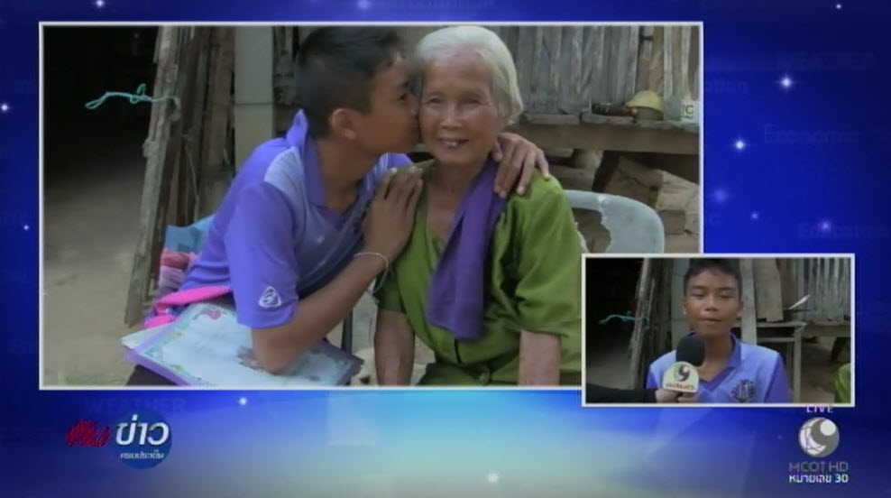 จากนั้นไม่นานน้องทอปได้ถีบจักรยานเข้ามาในบ้าน เมื่อผู้สื่อข่าวถามว่าไปไหนมา ทอปบอกว่าไปอ่านหนังสือที่บ้านเพื่อน จากนั้นก็เข้าไปตักน้ำดื่มในโอ่งมาใส่กระติกไว้เพื่อไว้ใช้ดื่มกิน พร้อมกับกล่าวว่าชีวิตทุกวันนี้มีความสุขมากที่ได้อยู่กับยาย นอนกับยายทุกคืน รู้สึกสบายใจที่มีโอกาสได้ดูแลยาย ส่วนตนเองจะตั้งใจเรียนให้ดีที่สุด ฝันไว้ว่าอยากจะเป็นตำรวจ ทุกวันนี้เรียนได้เกรด 3.69 และได้เป็นตัวแทนของโรงเรียนไปแข่งขัน (เอแมท) ระดับประเทศซึ่งมีผู้ร่วมเข้าแข่งขันถึง 500 กว่าทีม ทีมของตนเองได้ลำดับที่ 116 พร้อมโชว์ใบประกาศณียบัตรให้ผู้สื่อข่าวดู และกล่าวทิ้งท้ายว่ารักยายมากที่สุดในชีวิตพร้อมกับเข้าหอมแก้มยายด้วยความรัก.-สำนักข่าวไทย