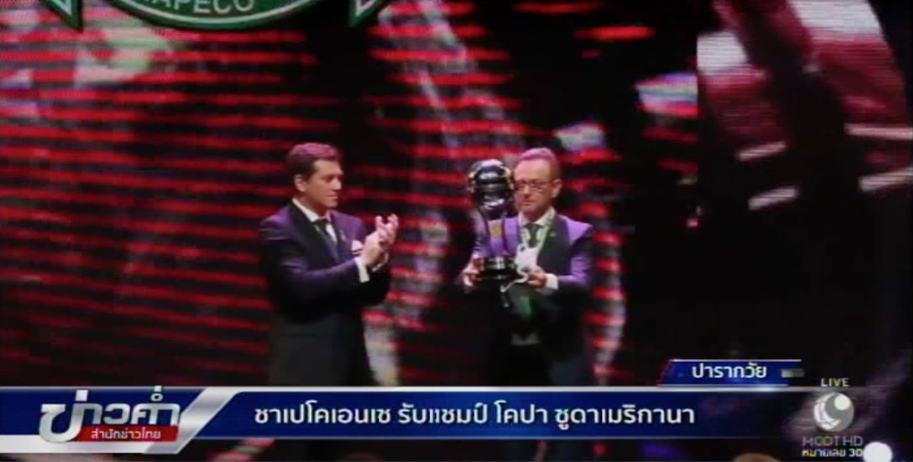 สหพันธ์ฟุตบอลแห่งอเมริกาใต้ หรือคอมเมโบล นำถ้วยแชมป์โคปา ซูดาเมริกานา พร้อมเงินรางวัลมามอบให้สโมสรชาเปโคเอนเซ อย่างเป็นทางการแล้ว หลังจากสโมสรจากแดนแซมบา กลายเป็นข่าวเศร้าสลดไปทั่วโลก เมื่อเครื่องบินที่พวกเขาโดยสาร เพื่อเดินทางไปแข่งขันเกมนัดชิงชนะเลิศรายการนี้ เกิดอุบัติเหตุตกในโคลอมเบีย จนมีผู้เสียชีวิตในเหตุการณ์ 71 และมีผู้เล่นชาเปโคเอนเซ รอดชีวิตมาเพียง 3 รายเท่านั้น ทำให้ทีมคู่แข่งในนัดชิงชนะเลิศอย่าง แอตเลติโก นาซิอองนาล จากโคลอมเบีย ตัดสินใจสละถ้วยแชมป์ให้แก่ชาเปโคเอนเซ เพื่ออุทิศให้แก่นักฟุตบอลและเจ้าหน้าที่ผู้จากไป. -สำนักข่าวไทย
