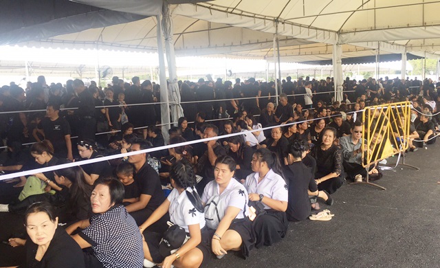 บรรยากาศในการรอคิวขึ้นกราบถวายบังคมพระบรมศพพระบาทสมเด็จพระปรมินทรมหาภูมิพลอดุลยเดช ที่บริเวณท้องสนามหลวง ตลอดช่วงเช้าถึงบ่าย ท้ายคิวอยู่ใจกลางท้องสนามหลวงและด้วยสภาพอากาศที่ร้อนจัด ทำให้เจ้าหน้าที่ต้องประกาศประชาสัมพันธ์ให้ประชาชนที่มาเข้าคิวเว้นระยะห่าง เพื่อให้อากาศถ่ายเท ป้องกันการเป็นลมแดด