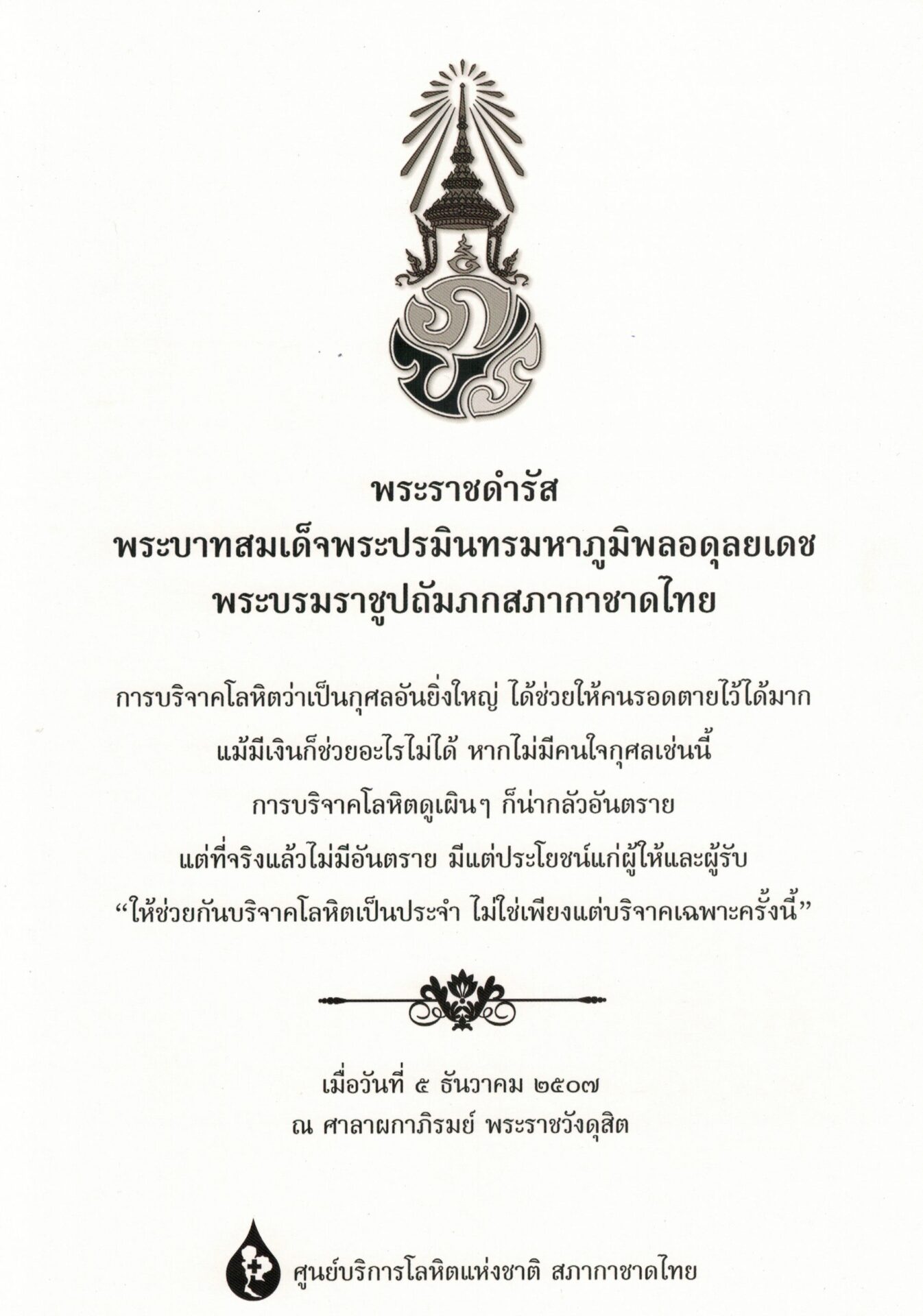 ทั้งนี้ ผู้บริจาคโลหิตจะได้รับบรมฉายาลักษณ์พระบาทสมเด็จพระปรมินทรมหาภูมิพลอดุลยเดช ทรงฉลองพระองค์บรมราชภูษิตาภรณ์ พิมพ์ลงบนโปสการ์ดขนาด A4 อย่างงดงามและทรงคุณค่า ส่วนด้านหลังภาพจะมีพระราชดำรัสพระองค์ ที่พระราชทานชมเชยการบริจาคโลหิต เมื่อวันที่ 5 ธันวาคม 2507 ณ ศาลาผกาภิรมย์ พระราชวังดุสิต ด้วยสำนึกในพระมหากรุณาธิคุณอันหาที่สุดมิได้ที่ทรงมีต่อพสกนิกรชาวไทยมาอย่างยาวนาน