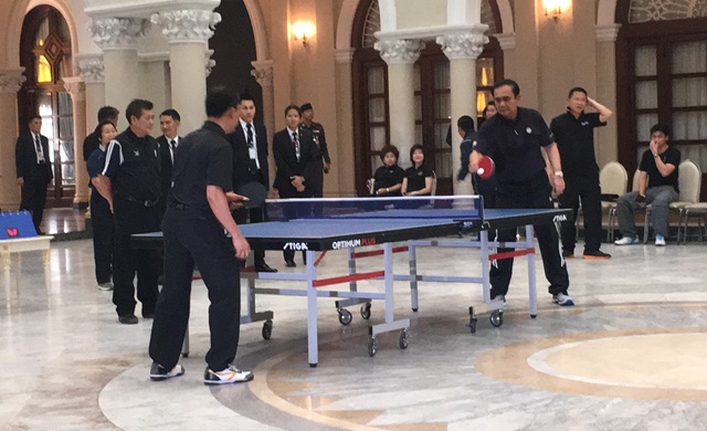 จากนั้น นายกรัฐมนตรี ได้โชว์ลีลาการตีเทเบิลเทนนิส หรือ ปิงปอง ภายในห้องโถง ตึกสันติไมตรี ทำเนียบรัฐบาล กับข้าราชการ โดยในเซตแรกนายกรัฐมนตรี แพ้ไปด้วยคะแนน 2:11 และเซตที่สอง ก็แพ้ด้วยคะแนน 3:11 จากนั้นนายกรัฐมนตรี ได้ตีปิงปองกับตัวแทนสื่อมวลชน โดยนายกรัฐมนตรี แพ้ด้วยคะแนน 7:11 ท่ามกลางเสียงเชียร์ของข้าราชการอย่างสนุกสนาน