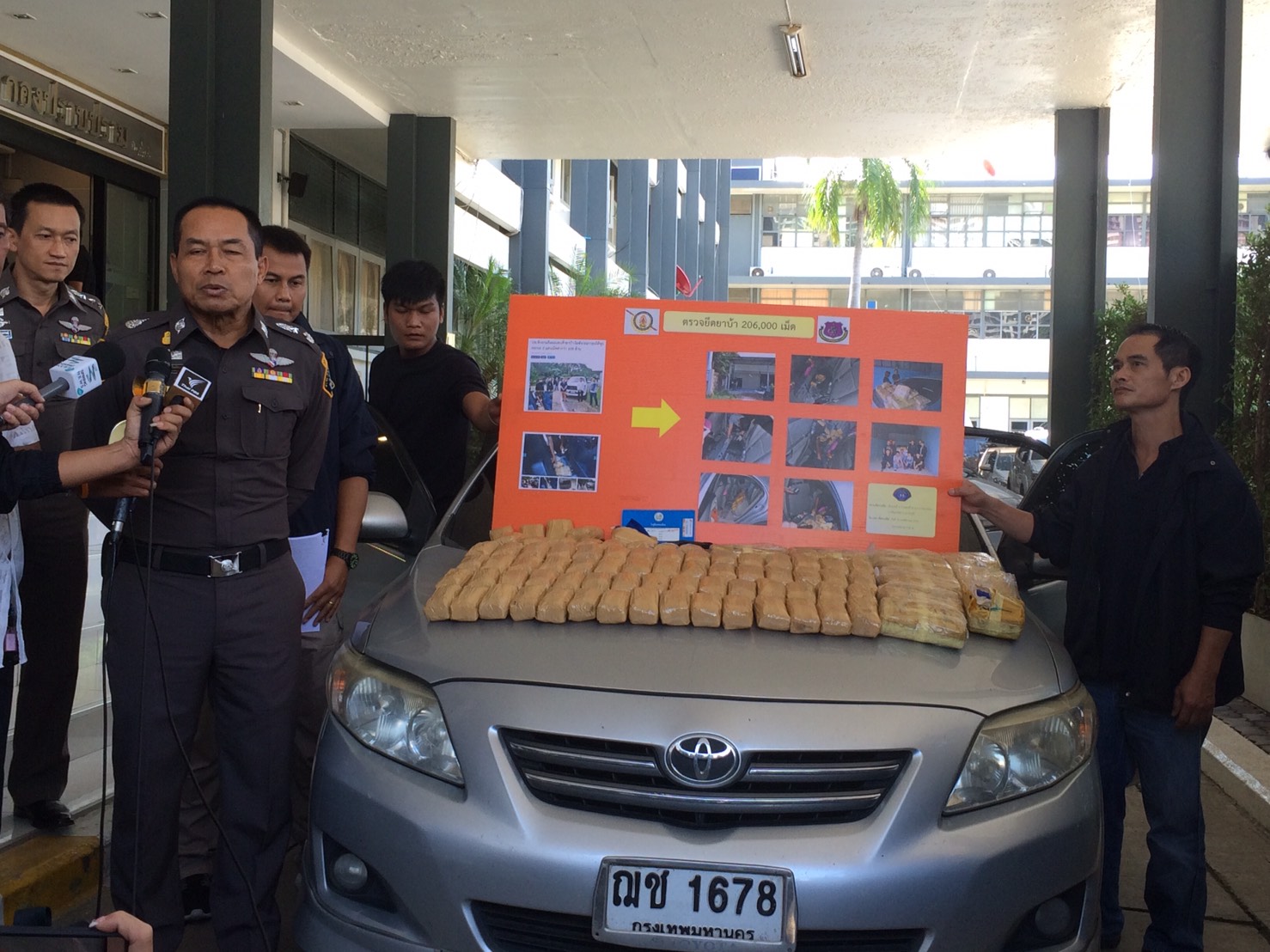 พลตำรวจตรีสุทิน ทรัพย์พ่วง รักษาราชการแทนผู้บังคับการกองปราบปราม แถลงผลการตรวจยึดยาบ้า 206,000 เม็ด ซุกซ่อนภายในช่องลับบริเวณเบาะหลังของรถยนต์โตโยต้า อัลติส สีเทา ทะเบียน ฌช 1678 กรุงเทพมหานคร