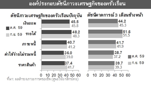 บริษัท ศูนย์วิจัยกสิกรไทย จำกัด รายงานว่าดัชนีภาวะเศรษฐกิจครัวเรือนเดือนตุลาคม 2559 ปรับตัวลดลงมาอยู่ที่ระดับ 42.9 จากระดับ 44.2 ในเดือนกันยายน 2559 โดยครัวเรือนมีความกังวลเพิ่มขึ้นในสถานการณ์ราคาสินค้า หลังราคาสินค้าอุปโภค-บริโภคปรับตัวสูงขึ้นในเดือนตุลาคม ซึ่งส่งผลต่อเนื่องให้ครัวเรือนเป็นกังวลต่อประเด็นเรื่องค่าใช้จ่าย (ไม่รวมหนี้) มากขึ้นตามไปด้วย ขณะที่ดัชนีสะท้อนมุมมองคาดการณ์ 3 เดือนข้างหน้า ยังคงทรงตัวอยู่ในระดับเดิมที่ 44.4 ติดต่อกันเป็นเดือนที่ 3 สะท้อนให้เห็นว่าครัวเรือนยังไม่เปลี่ยนแปลงความเชื่อมั่นต่อเศรษฐกิจไทยในระยะข้างหน้า ซึ่งก็น่าจะส่งผลให้การบริโภคของภาคเอกชนในช่วงระยะเวลาที่เหลือของปี 2559 ประคองตัวไปได้