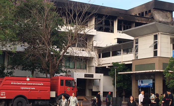 21 มี.ค.- มีการกันพื้นที่ห้ามผู้ไม่เกี่ยวข้องเข้าไปในอาคาร สนง.กปภ.สำนักงานใหญ่ หลังเกิดเพลิงไหม้ค่ำวานนี้(20 มี.ค.) กองพิสูจน์หลักฐาน-วิศวกรรมสถาน เตรียมเก็บหลักฐานหาสาเหตุและตรวจสภาพอาคาร หวั่นทรุดตัว