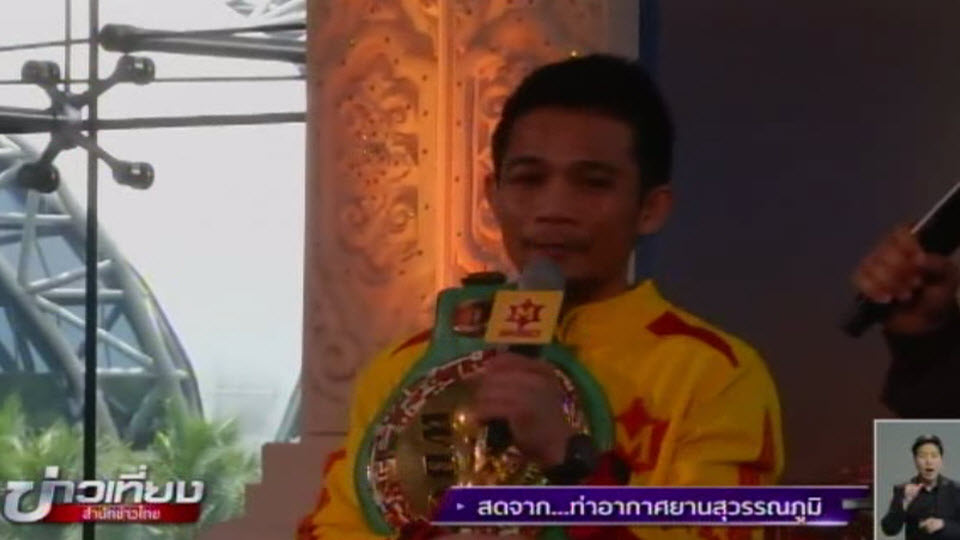 สุวรรณภูมิ 21 มี.ค.-บรรดากองเชียร์ รวมถึงครอบครัวของ “ศรีสะเกษ นครหลวงโปรโมชั่น” เดินทางไปรอรับฮีโร่นักชกชาวไทยที่เดินทางกลับประเทศ หลังคว้าแชมป์โลกรุ่นซูเปอร์ฟลายเวทของ WBC มาครอง.-สำนักข่าวไทย