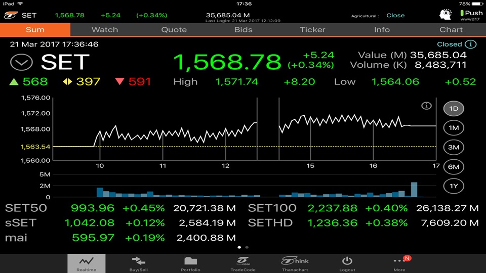 ผู้สื่อข่าวรายงานว่าวันนี้ (21 มี.ค.) ดัชนีตลาดหลักทรัพย์ฯ ปิดที่ระดับ 1,568.78 จุด เพิ่มขึ้น 5.24 จุด หรือร้อยละ 0.34 มูลค่าการซื้อขาย 35,685.04 ล้านบาท โดยดัชนีเคลื่อนไหวแดนบวกตลอดทั้งวัน ขยับขึ้นแตะจุดสูงสุดของวันที่ระดับ 1,571.74 จุด ขณะที่ดัชนีทำระดับต่ำสุดของวันที่ 1,564.06 จุด