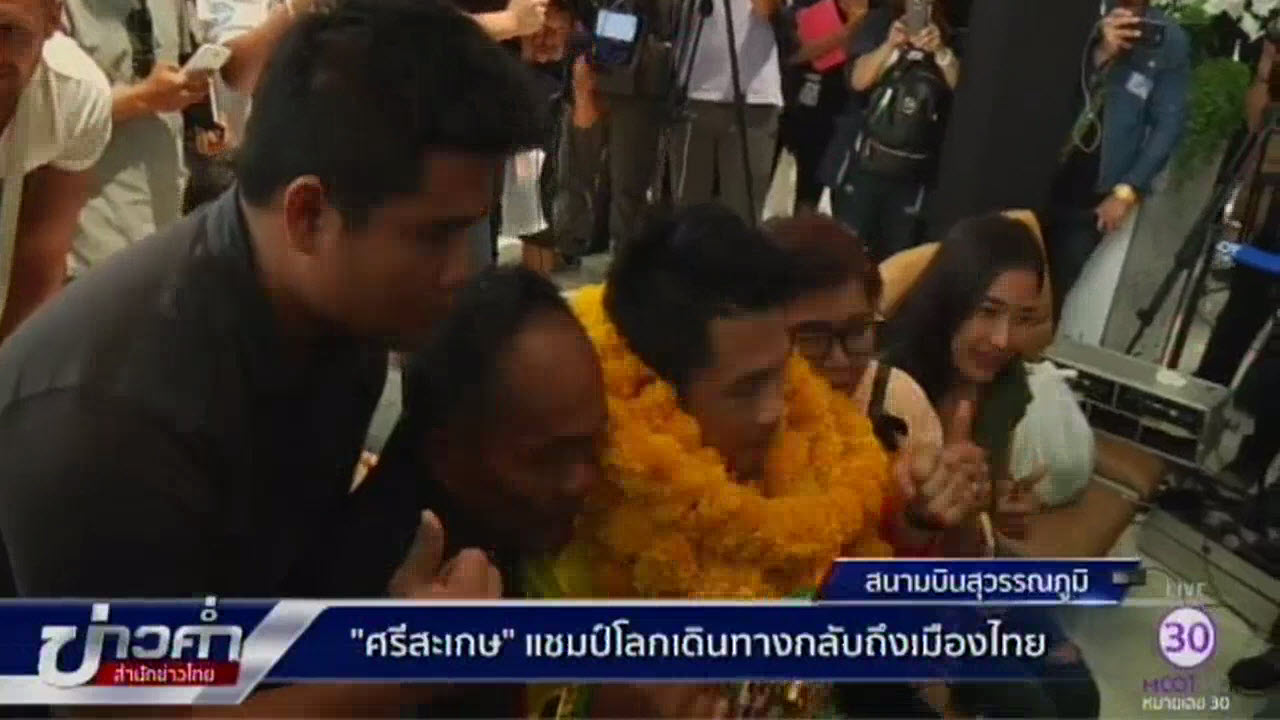 กรุงเทพฯ 21 มี.ค.-ศรีสะเกษ นครหลวงโปรโมชั่น เดินทางกลับถึงประเทศไทย หลังคว้าเข็มขัดแชมป์โลกรุ่นซุปเปอร์ฟลายเวท สภามวยโลก พร้อมรับเงินอัดฉีดทันที 1 ล้านบาท “เจ้าแหลม” ศรีสะเกษ นครหลวงโปรโมชั่น หรือวิศักดิ์ศิลป์ วังเอก แชมป์โลกชาวไทย เดินทางกลับมาถึงเมืองไทยเมื่อช่วงเที่ยงวันนี้ หลังเอาชนะโรมัน กอนซาเลซ นักชกนิคารากัว คว้าแชมป์โลกรุ่นซุปเปอร์ฟลายเวท สภามวยโลก โดยมีนายเจียมศักดิ์ วังเอก และนางหนูรัตน์ วังเอก บิดา มารดา รวมถึงครอบครัว และ “น้องเก๋” พัชรีวรรณ กันหา แฟนสาวมารอต้อนรับอย่างอบอุ่นที่สนามบินสุวรรณภูมิ