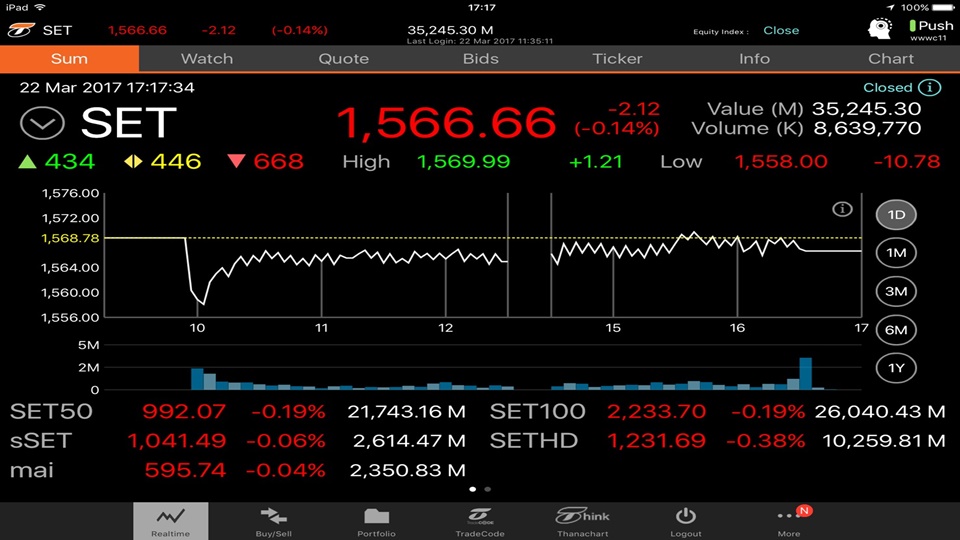ผู้สื่อข่าวรายงานว่าดัชนีตลาดหลักทรัพย์ฯ ปิดที่ระดับ 1,566.66 จุด ลดลง 2.12 จุด หรือร้อยละ 0.14 มูลค่าการซื้อขาย 35,245.30 ล้านบาท โดยดัชนีเคลื่อนไหวแดนลบเป็นส่วนใหญ่ ขยับขึ้นแตะจุดสูงสุดของวันที่ระดับ 1,569.99 จุด ขณะที่ดัชนีทำระดับต่ำสุดของวันที่ 1,558.00 จุด
