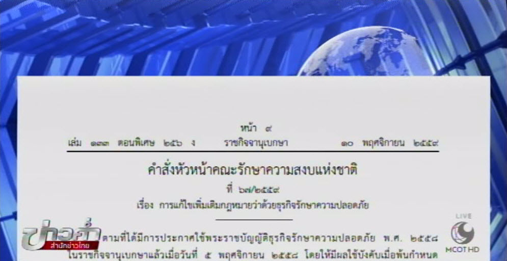สำนักข่าวไทย 10 พ.ย.-ราชกิจจานุเบกษา เผยแพร่คําสั่งหัวหน้าคณะรักษาความสงบแห่งชาติ ที่ 67/2559 เรื่อง การแก้ไขเพิ่มเติมกฎหมายว่าด้วยธุรกิจรักษาความปลอดภัย