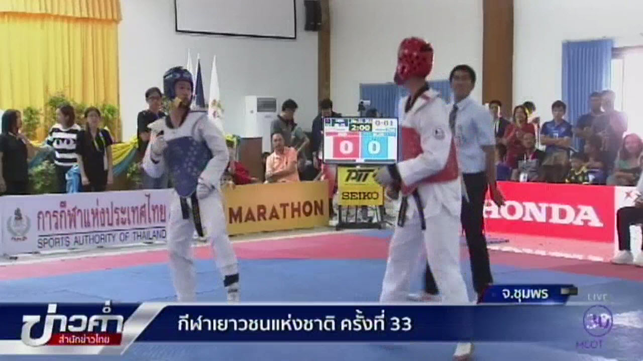 ชุมพร 22 มี.ค.-เทควันโดวันนี้ชิง 6 เหรียญทอง ที่โรงเรียนเทศบาล 1 บ้านท่าตะเภา ประเภทต่อสู้เดี่ยวชาย รุ่นไม่เกิน 73 กก.ชาย วริทธิ์ เมืองโครต จากจังหวัดกาฬสินธิ์ ฝ่ายน้ำเงิน พบกับ ธนดล เยี่ยมยืนยง จากจังหวัดชุมพร เจ้าภาพ ปรากฎว่า วริทธิ์ อาศัยใช้จังหวะความเร็วดักทำคะแนนเข้าเป้าเอาชนะธนดล นักกีฬาเจ้าภาพขาดลอย 12-4 คะแนนคว้าเหรียญทองไปครอง