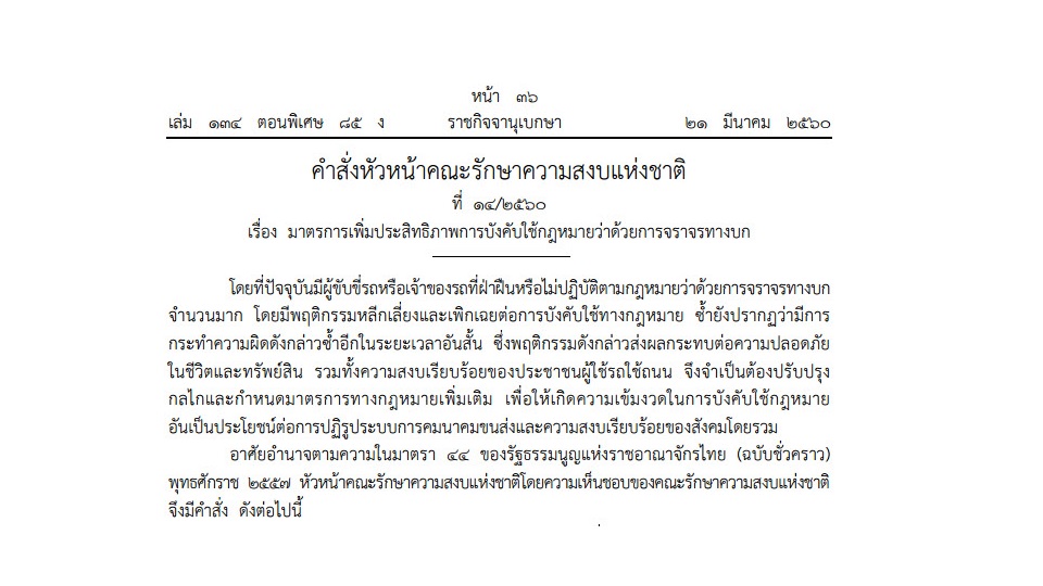 สำหรับ ม.44 เพิ่มประสิทธิภาพการบังคับใช้กฎหมายการจราจรทางบกนั้นมีออกมาจริง เมื่อ 21 มี.ค.2560