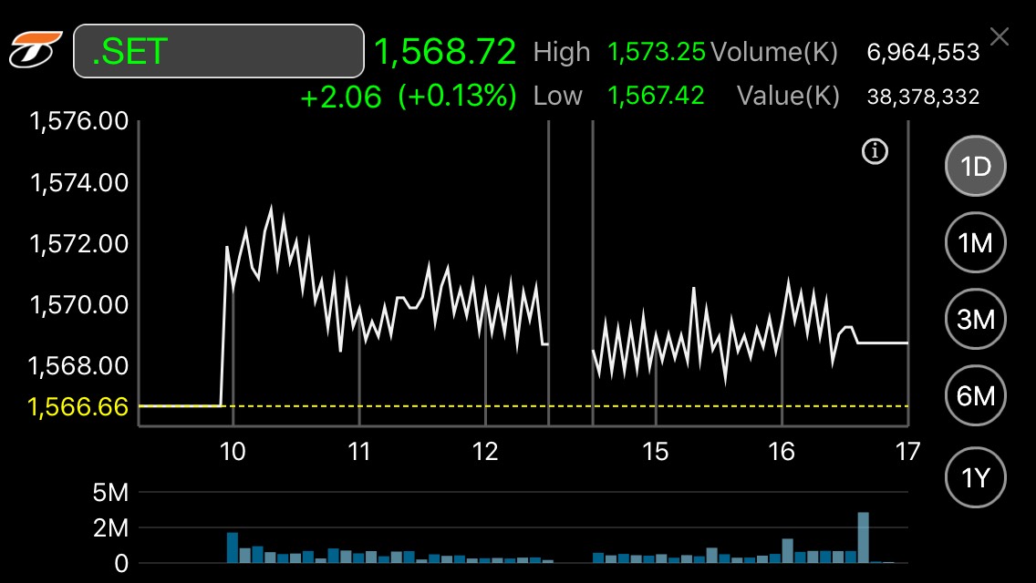 ผู้สื่อข่าวรายงานว่าดัชนีตลาดหลักทรัพย์ฯ ปิดการซื้อขายที่ระดับ 1,568.72 จุด เพิ่มขึ้น 2.06 จุด หรือร้อยละ 0.13 มูลค่าการซื้อขาย 38,378.33 ล้านบาท โดยดัชนีเคลื่อนไหวแดนบวกตลอดทั้งวัน ขยับขึ้นแตะจุดสูงสุดของวันที่ระดับ 1,573.25 จุด ขณะที่ดัชนีทำระดับต่ำสุดของวันที่ 1,567.42 จุด