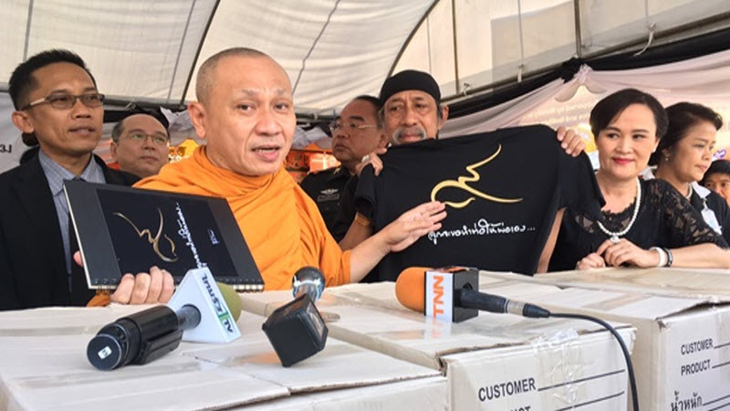 ผู้สื่อข่าวรายงานว่า เวลา 16.00 น. วันนี้ (10 พ.ย.) บริเวณเต็นท์หน้าสำนักงานปลัดกระทรวงกลาโหม พระอาจารย์กวง หรือ ธีระพันธุ์ ลอไพบูลย์ ประธานชมรมธุลีไท อดีตนักโฆษณาชื่อดัง นักวาดภาพ พร้อมคณะ อาทิ ภริยาเจ้ากรมเสมียนตรากลาโหม ถั่วแระ เชิญยิ้ม และคณะมิสไทยแลนด์เวิลด์ 2015 และ 2016 มาช่วยแจกเสื้อยืดคอกลมสีดำ จำนวน 999 ตัว ที่สกรีนด้านหน้าเป็นเลข ๙ และข้อความ “ลูกจะขอทำต่อให้พ่อเอง” ส่วนด้านหลังเป็นบทกลอน