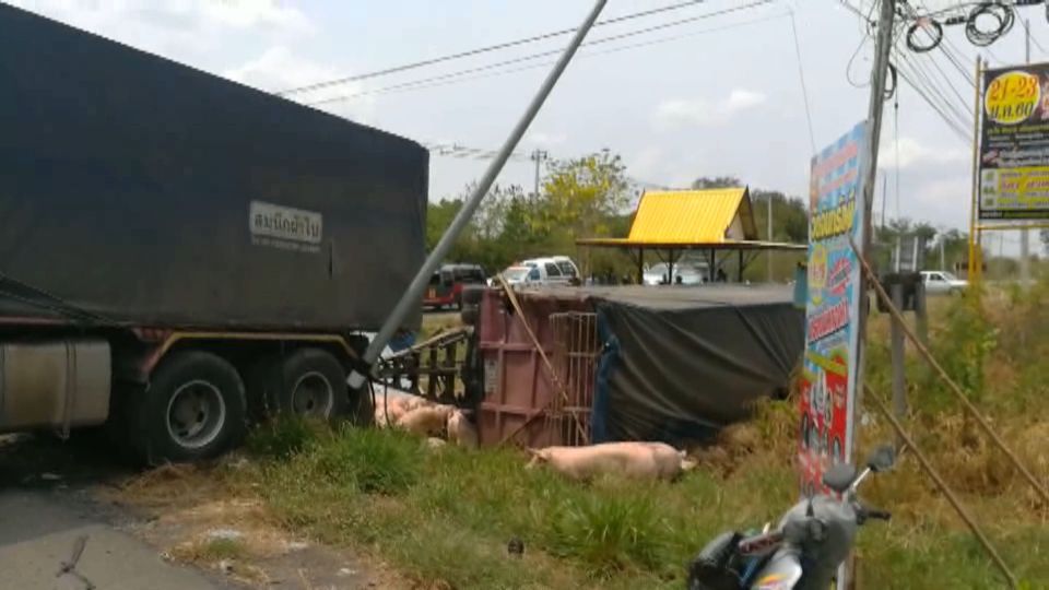 บ่ายวันนี้ (24 มี.ค.) ร.ต.อ.นพ จิ๋วแหยม รอง สว.(สอบสวน) สภ.พัฒนานิคม อ.พัฒนานิคม ลพบุรี ได้รับแจ้งอุบัติเหตุรถพ่วงชนกับรถบรรทุกสุกรบริเวณสี่แยกซอย 24 สายจัตวา หมู่ 5 อ.พัฒนานิคม จึงประสานมูลนิธิและแพทย์เข้าตรวจสอบเป็นรถพ่วงทะเบียน 82-1717 เพชรบูรณ์ ตกอยู่ข้างทาง ส่วนรถบรรทุกสุกรเป็นรถ 10 ล้อ ทะเบียน 70-1918 ลพบุรี พลิกตะแคง มีผู้บาดเจ็บ 3 ราย นายสุพจน์ เสื้อเลี้ยง อายุ 28 ปี คนขับ น.ส.แพรแก้ว อินมา อายุ 20 ปี และเด็กหญิง อายุ 2 ปี ถูกนำส่งโรงพยาบาลพัฒนานิคม ส่วนสุกรที่บรรทุกมาไม่ต่ำกว่า 60 ตัว กระเด็นออกจากรถหลายสิบตัว บางตัวตายและบาดเจ็บ