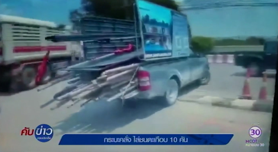 ผู้ใช้เฟซบุ๊กชื่อ “เอก คอนเนกชั่น” ได้โพสต์คลิปจากกล้องหน้ารถ เผยให้เห็นภาพรถกระบะคันหนึ่งบรรทุกไม้และแผ่นโลหะ พยายามวิ่งมาด้วยความเร็วสูง เฉี่ยวชนกับรถยนต์หลายคันได้รับความเสียหาย ก่อนจะจนมุมพุ่งเข้าชนเกาะกลางถนน รถเก๋งสีขาวที่วิ่งสวนมาถูกชน