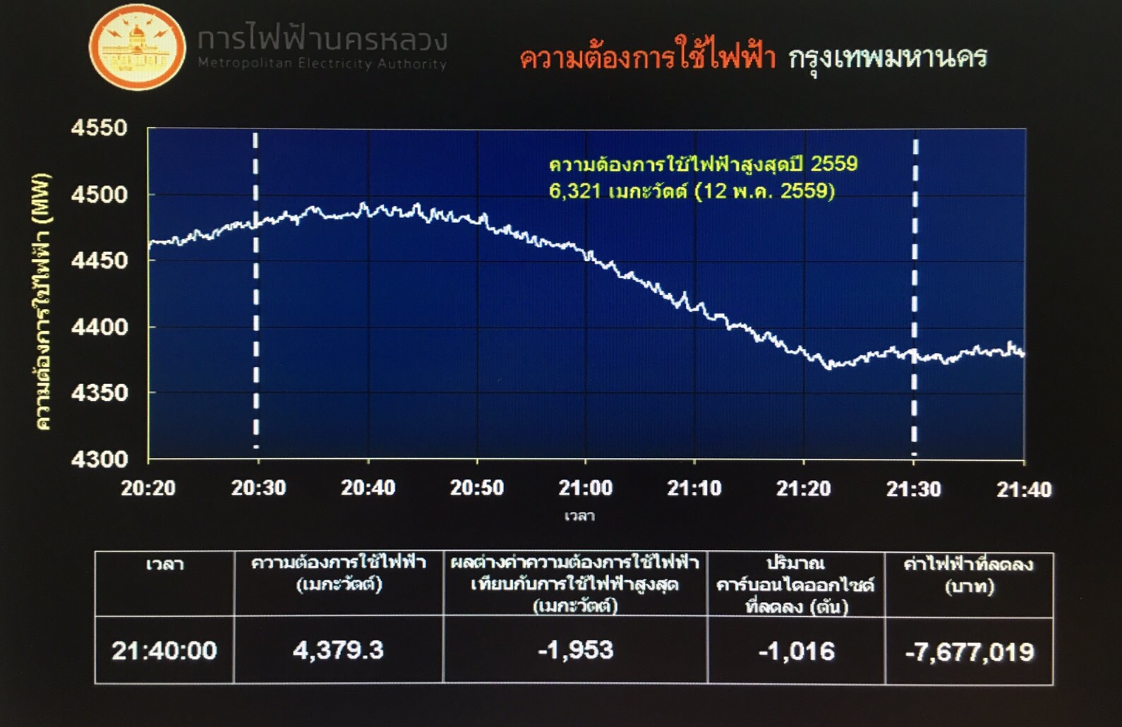 นายรุจ เหราบัตย์ รองผู้ว่าการการไฟฟ้านครหลวง แถลงผลการดำเนินโครงการปิดไฟ 1 ชั่วโมง เพื่อลดโลกร้อน ประจำปี 2560 (60+ Earth hour 2017) ในวันที่ 25 มีนาคม 2560 ระหว่างเวลา 20.30 – 21.30 น. พบว่าสามารถลดการใช้ไฟฟ้าลงได้ 1,953 เมกะวัตต์ เมื่อเปรียบเทียบกับการใช้ไฟฟ้าสูงสุดของกรุงเทพมหานคร เมื่อวันที่ 12 พฤษภาคม 2559 ที่มีปริมาณการใช้ไฟฟ้าในเขตกรุงเทพมหานคร 6,321.67 เมกะวัตต์หรือคิดเป็นอัตราการลดการใช้ไฟฟ้าลงได้ 7,677,019 บาท