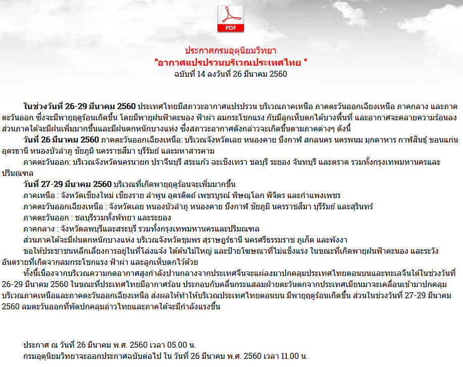 กรมอุตุนิยมวิทยา ประกาศเตือนอากาศแปรปรวน ฉบับที่ 14 ในช่วงวันที่ 26-29 มีนาคม 2560 ประเทศไทยมีสภาวะอากาศแปรปรวน บริเวณภาคเหนือ ภาคตะวันออกเฉียงเหนือ ภาคกลาง และภาคตะวันออก ซึ่งจะมีพายุฤดูร้อนเกิดขึ้น โดยมีพายุฝนฟ้าคะนอง ฟ้าผ่า ลมกระโชกแรง กับมีลูกเห็บตกได้บางพื้นที่ และอากาศจะคลายความร้อนลง ส่วนภาคใต้จะมีฝนเพิ่มมากขึ้นและมีฝนตกหนักบางแห่ง ซึ่งสภาวะอากาศดังกล่าวจะเกิดขึ้นตามภาคต่างๆ ดังนี้