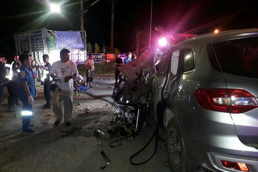 ราชบุรี 27 มี.ค.- เก๋งป้ายแดงกลับจากงานเลี้ยงบวชนาคฝ่าสายชนท้ายสิบล้อบรรทุกมะม่วงเต็มแรงถนนราชบุรี กำนัน-อดีตผู้ใหญ่บ้านเสียชีวิต