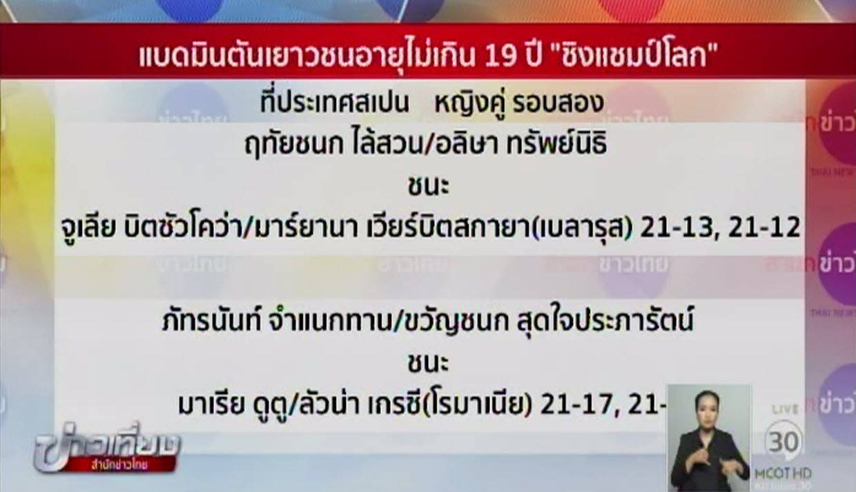 ผลการแข่งขันแบดมินตันเยาวชนอายุไม่เกิน 19 ปี “ชิงแชมป์โลก” ประเภทบุคคล ที่เมืองบิลเบา ประเทศสเปน เมื่อคืนที่ผ่านมา ประเภท หญิงคู่ รอบ 2 ฤทัยชนก ไล้สวน กับ อลิษา ทรัพย์นิธิ คู่มือ 4 ของรายการของไทย เอาชนะ จูเลีย บิตซัวโคว่า กับ มาร์ยานา เวียร์บิตสกายา จากเบลารุส 2 เกมรวด 21-13, 21-12 ผ่านเข้ารอบ 3 ต่อไป