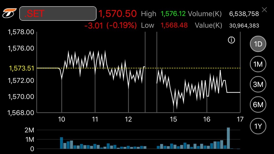 ผู้สื่อข่าวรายงานว่าดัชนีตลาดหลักทรัพย์แห่งประเทศไทย (ตลท.) ปิดการซื้อขายวันนี้ (27 มี.ค.) ที่ระดับ 1,570.50 จุด ลดลง 3.01 จุด หรือร้อยละ 0.19 มูลค่าการซื้อขาย 30,964.38 ล้านบาท โดยดัชนีเคลื่อนไหวในกรอบแคบ ๆ สูงสุดของวันที่ระดับ 1,576.12 จุด และต่ำสุดที่ระดับ 1,568.48 จุด