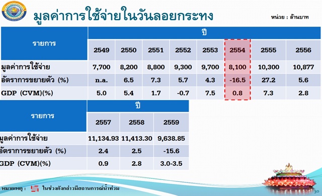 นายธนวรรธน์ พลวิชัย ผู้อำนวยการศูนย์พยากรณ์เศรษฐกิจและธุรกิจ มหาวิทยาลัยหอการค้าไทย เปิดเผยผลสำรวจพฤติกรรมและการใช้จ่ายของประชาชนในช่วงวันลอยกระทงปี 2559 พบว่ากลุ่มตัวอย่างส่วนใหญ่ยังคงวางแผนไปลอยกระทง แต่ยังคงอยู่ในบรรยากาศของความโศกเศร้า คือ มีความสนุกสนานน้อยกว่าเดิม หรือเงียบเหงากว่าเดิมส่งผลทำ ให้มีการจับจ่ายใช้สอยในช่วงดังกล่าวไม่มาก แต่ยังคงมีการใช้จ่ายเฉลี่ยต่อคน 1,105.31 บาท โดยปีนี้มีเงินสะพัดช่วงดังกล่าวประมาณ 9,638.85 ล้านบาท ลดลงร้อยละ 15.6 เมื่อเทียบกับช่วงเดียวกันปีก่อน และเป็นการลดลงครั้งแรกในรอบ 4 ปี