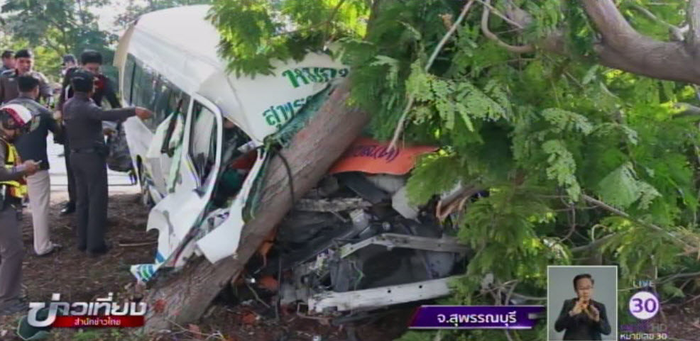 รถตู้สายอู่ทอง สุพรรณบุรี-กรุงเทพฯ คันนี้ ประสบอุบัติเหตุอัดก๊อปปี้กับต้นไม้ ข้างถนนสาย 340 สุพรรณบุรี-บางบัวทอง อ.บางปลาม้า จ.สุพรรณบุรี ทั้งคนขับและผู้โดยสารติดอยู่ภายในรถรวม 5 คน เจ้าหน้าที่กู้ภัยเร่งใช้เครื่องมือตัดถ่างช่วยเหลือทั้งหมดออกมา แต่ปรากฏว่ามีผู้เสียชีวิตแล้ว 2 คน คือ นายสถิตร คำถาไพร คนขับรถตู้ และนายวงศ์กร ชัยเสรี ผู้โดยสาร ขณะที่ผู้บาดเจ็บอีก 3 คน ถูกนำตัวส่งโรงพยาบาลบางปลาม้า
