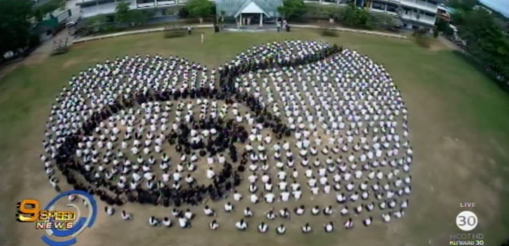 คณะครู นักเรียน และบุคลากรทางการศึกษา โรงเรียนเซกา จ.บึงกาฬ 1,699 คน ร่วมกันแปรอักษรเป็นรูปเลข ๙ ล้อมรอบด้วยรูปหัวใจ เพื่อแสดงความอาลัย และน้อมสำนึกในพระมหากรุณาธิคุณของพระบาทสมเด็จพระปรมินทรมหาภูมิพลอดุลยเดช. – สำนักข่าวไทย
