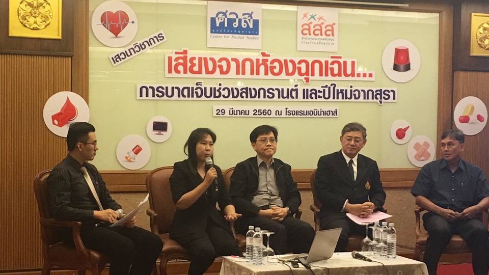 ในการเสวนาวิชาการ เสียงจากห้องฉุกเฉิน การบาดเจ็บช่วงสงกรานต์และปีใหม่จากสุรา โดยศูนย์วิจัยปัญหาสุรา (ศวส.) ร่วมกับสำนักงานเครือข่ายองค์กรงดเหล้า (สคส.) และสำนักงานกองทุนสนับสนุนการสร้างเสริมสุขภาพ (สสส.)