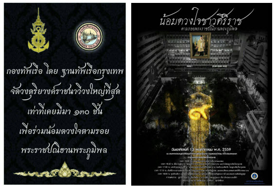 โดยฐานทัพเรือกรุงเทพจะจัดวงดุริยางค์ราชนาวี วงใหญ่ที่สุดเท่าที่เคยมีมา 130 ชิ้น ไปบรรเลงเพลงพระราชนิพนธ์ เพื่อร่วมน้อมดวงใจตามรอยพระราชปณิธานฯ และจะมีพิธีถวายสักการะของหน่วยงานต่างๆ และการกล่าวแสดงความอาลัย โดย พล.ร.อ.ณะ อารีนิจ ผู้บัญชาการทหารเรือ และคณบดีคณะแพทยศาสตร์ศิริราชพยาบาล ร่วมด้วยกำลังพลของกองทัพเรือ โดยฐานทัพเรือกรุงเทพ และบุคลากรของศิริราชพยาบาล ตลอดจนพี่น้องประชาชนทุกหมู่เหล่า