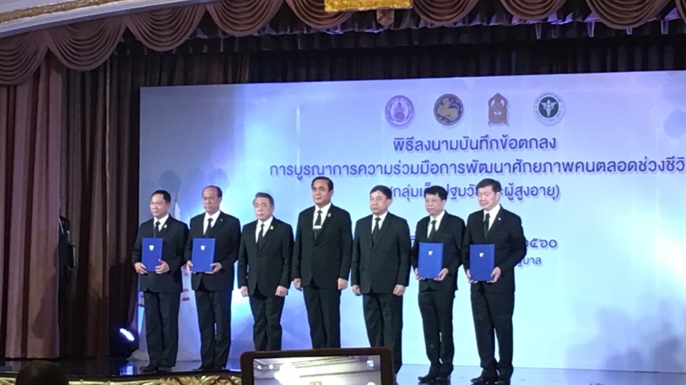 ผู้สื่อข่าวรายงานว่า วันนี้ (30 มี.ค.) พล.อ.ประยุทธ์ จันทร์โอชา นายกรัฐมนตรีและหัวหน้าคณะรักษาความสงบแห่งชาติ (คสช.) เป็นประธานในพิธีลงนามบันทึกข้อตกลงความร่วมมือ “การบูรณาการเพื่อการพัฒนาคนตลอดช่วงชีวิต สำหรับกลุ่มเด็กปฐมวัยและผู้สูงอายุ” ระหว่างรัฐมนตรีว่าการ 4 กระทรวง ได้แก่ กระทรวงการพัฒนาสังคมและความมั่นคงของมนุษย์ กระทรวงมหาดไทย กระทรวงศึกษาธิการ และกระทรวงสาธารณสุข โดยมีรองนายกรัฐมนตรีและผู้บริหารระดับสูงจาก 4 กระทรวง ร่วมเป็นสักขีพยาน ซึ่งการลงนามในบันทึกข้อตกลงครั้งนี้ เป็นการร่วมกันขับเคลื่อนยุทธศาสตร์การพัฒนาคนตลอดช่วงชีวิตในกลุ่มเด็กปฐมวัยและผู้สูงอายุตามแผนยุทธศาสตร์ชาติ 20 ปีแผนยุทธศาสตร์ประเทศด้านสาธารณสุขและยุทธศาสตร์ประเทศไทย 4.0 เพื่อรองรับการเป็นสังคมสูงอายุและความสมดุลของประชากรในวัยต่าง ๆ ที่มีผู้สูงอายุเพิ่มขึ้นอย่างรวดเร็ว เป็นร้อยละ 20 ของประชากรทั้งประเทศ โดยจะเข้าสู่สังคมผู้สูงอายุโดยสมบูรณ์ในปี 2564 ขณะที่กลุ่มวัยเด็กและวัยทำงานที่ต้องดูแลผู้สูงอายุมีแนวโน้มลดลง มีปัญหาเด็กเกิดน้อยด้อยคุณภาพ ส่งผลกระทบต่อประชากรวัยทำงาน ซึ่งเป็นกำลังหลักในการขับเคลื่อนเศรษฐกิจของประเทศในอนาคต จึงต้องมีการตั้งเป้าหมาย “เด็กไทยเติบใหญ่มีคุณภาพ ผู้สูงวัยเป็นหลักชัยของสังคม มุ่งสู่ประเทศไทย 4.0” ในปี 2564