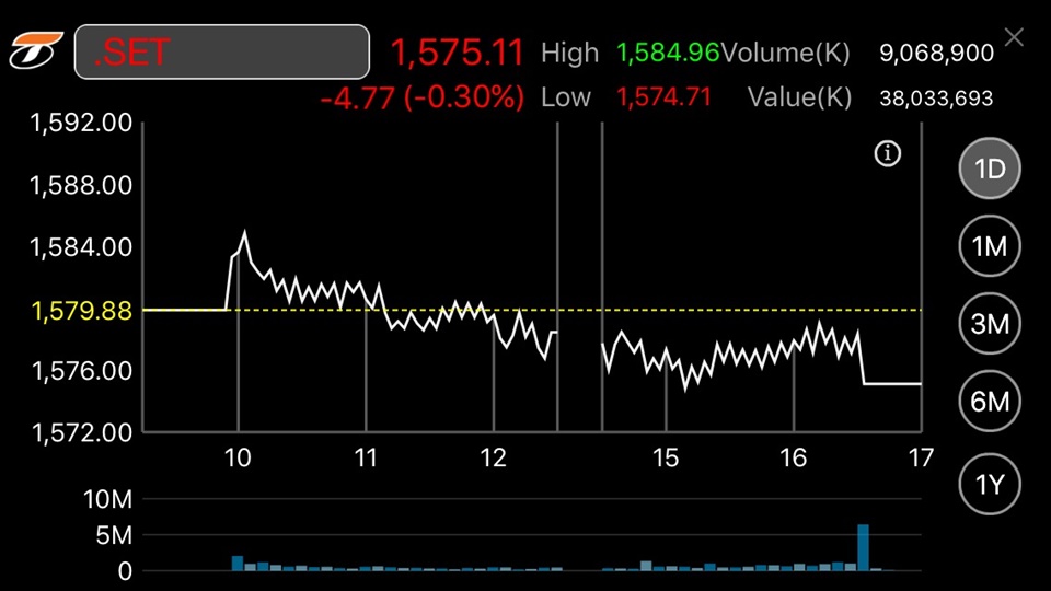 ผู้สื่อข่าวรายงานว่าวันนี้ (31 มี.ค.) ดัชนีตลาดหลักทรัพย์ฯ ปิดที่ระดับ 1,575.11 จุด ลดลง 4.77 จุด หรือ 0.30 มูลค่าการซื้อขาย 38,033.69 ล้านบาท โดยดัชนีเคลื่อนไหวทั้งแดนบวก-ลบ สูงสุดของวันที่ระดับ 1,584.96 จุด ขณะที่ดัชนีทำระดับต่ำสุดของวันที่ 1,574.71 จุด