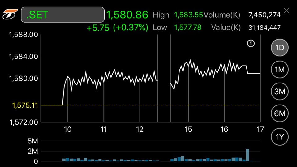 ผู้สื่อข่าวรายงานว่าตลาดหลักทรัพย์ฯ ปิดการซื้อขายวันนี้ (3 เม.ย.) ที่ระดับ 1,580.86 จุด เพิ่มขึ้นร้อยละ 0.37 มูลค่าการซื้อขาย 31,184.45 ล้านบาท โดยดัชนีอยู่ในแดนบวกตลอดทั้งวันแตะจุดสูงสุดของวันที่ระดับ 1,583.55 จุด และดัชนีต่ำสุดของวันที่ระดับ 1,577.78 จุด